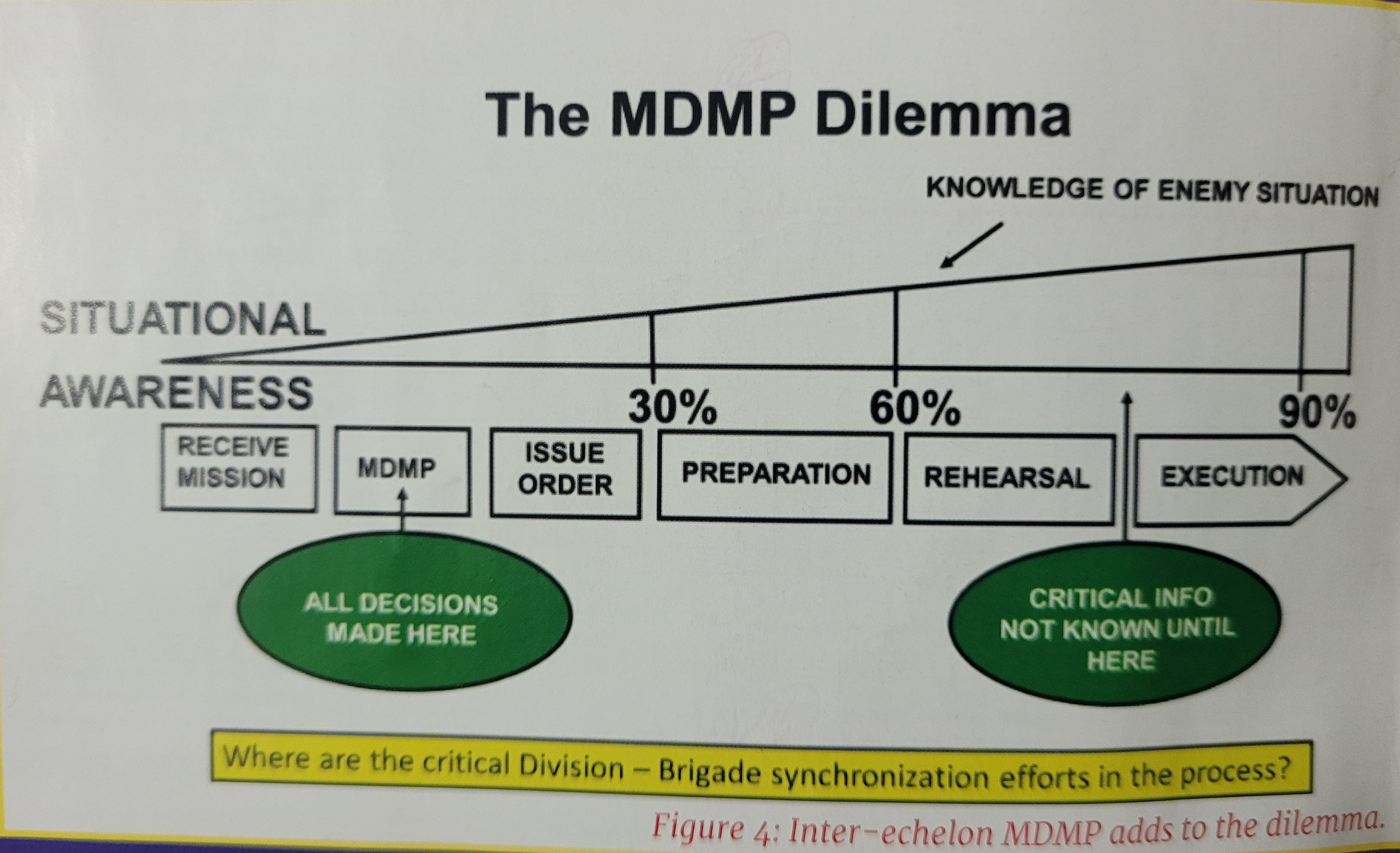 6. 사단에서 시간 수평선(temporal horizon) 관리는 MDMP의 어려운 문제를 해결하는 데 있어서 매우 중요하다. 사단이 주공을 한 여단에서 다른 여단으로 전환할 때, 시간 통합훈련(time synchronization drill)이 발생한다. 제10 산악사단의 계획수립 수평선은 여단의 계획수립 수평선과는 다르다. 제대 간 시각표의 일치는 기존 전투 리듬을 분열시키고 또한 통합하는 것을 어렵게 하지만, 적절한 예행연습을 관리하고 실시하기 위해서는 양 조직 모두에게 필수적으로 남아있다.